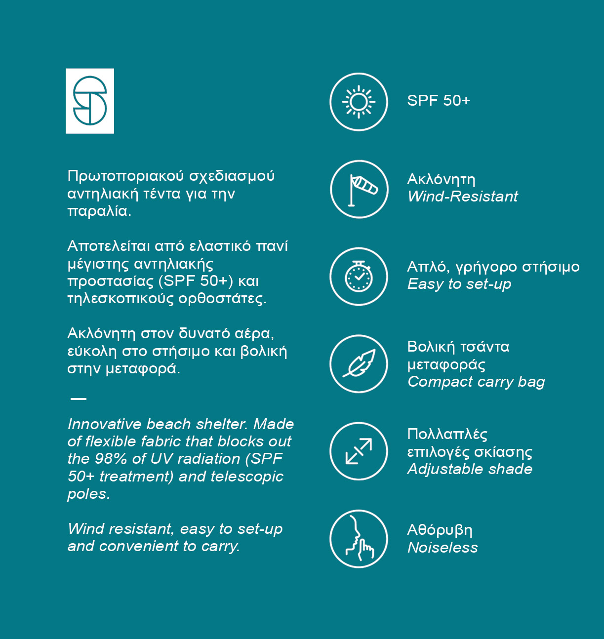 Αποτελείται από ελαστικό πανί μέγιστης αντηλιακής προστασίας SPF50+ , τηλεσκοπικούς ορθοστάτες αλουμινίου και σάκους αγκύρωσης.
