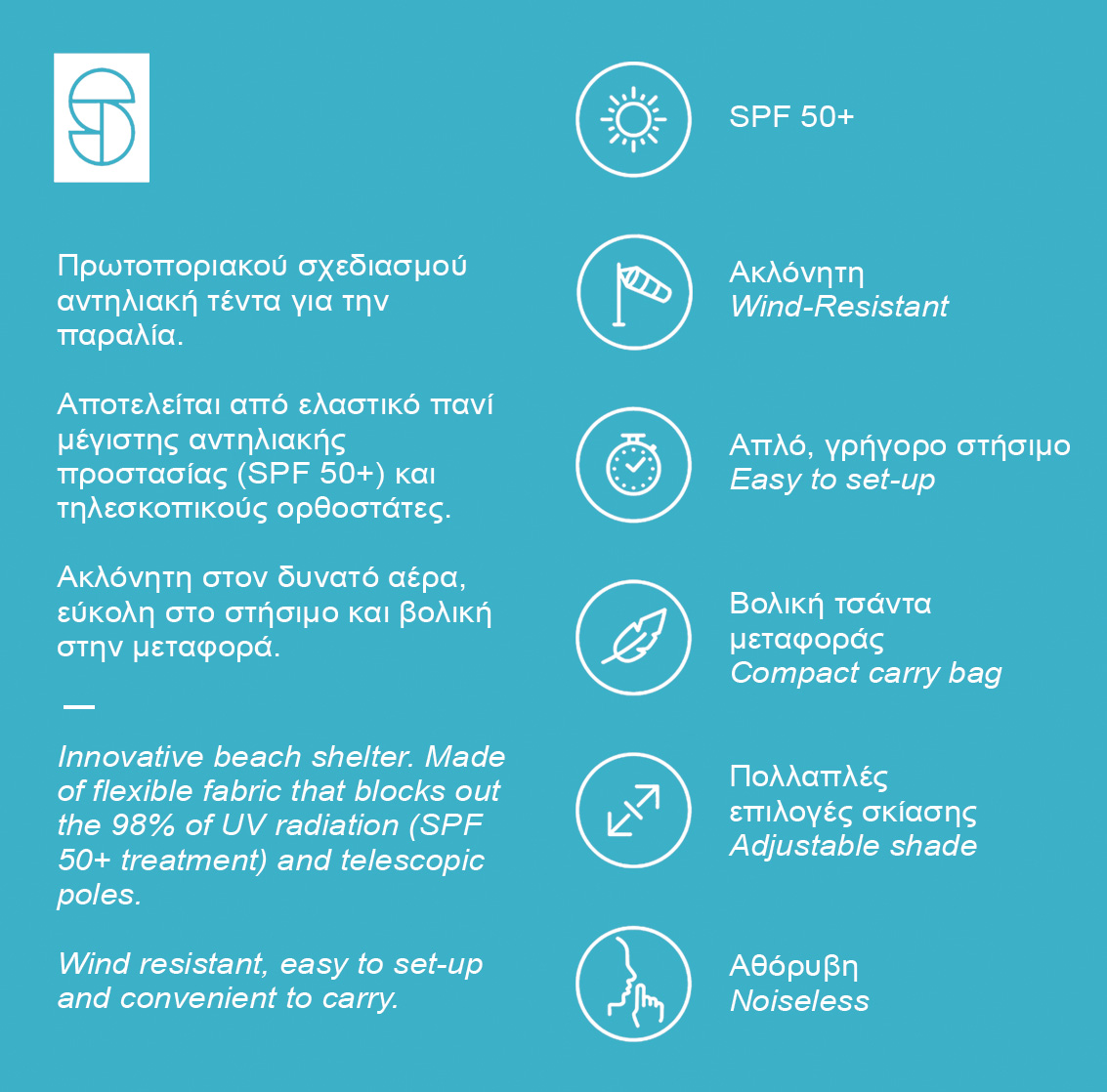 Αποτελείται από ελαστικό πανί μέγιστης αντηλιακής προστασίας SPF50+ , τηλεσκοπικούς ορθοστάτες αλουμινίου και σάκους αγκύρωσης.