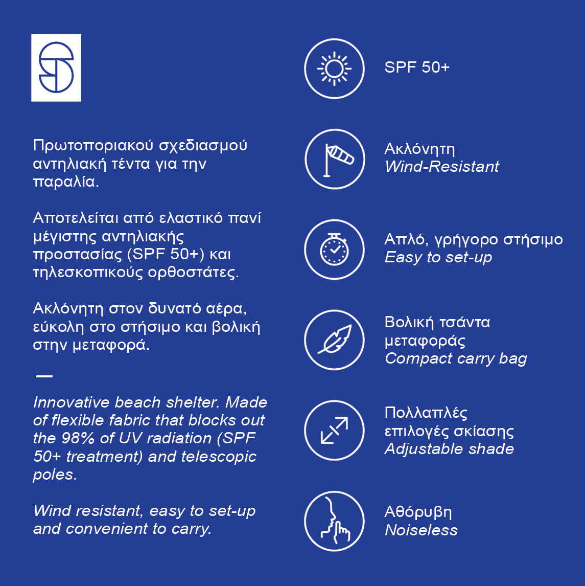 Αποτελείται από ελαστικό πανί μέγιστης αντηλιακής προστασίας SPF50+, τηλεσκοπικούς ορθοστάτες αλουμινίου και σάκους αγκύρωσης.