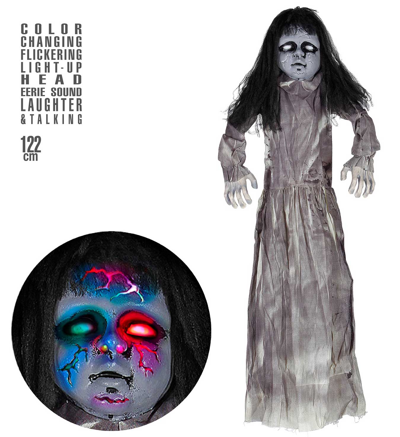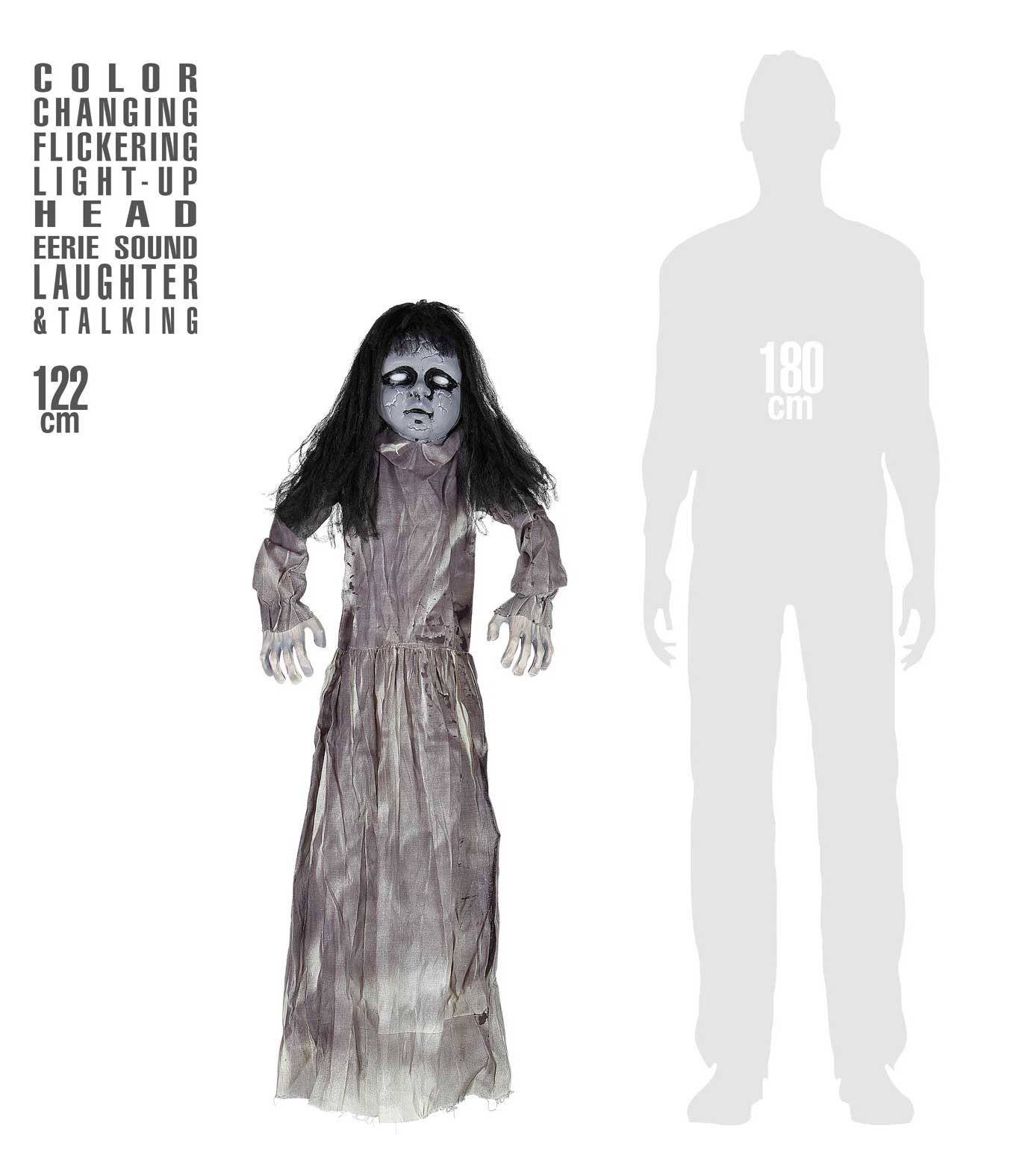 • motion sensor activated "LIVING DEAD DOLL WITH LIGHT-UP HEAD & POSSESSED SOUND" 122 cm - with "TRY ME" function (3 x AAA batteries included)