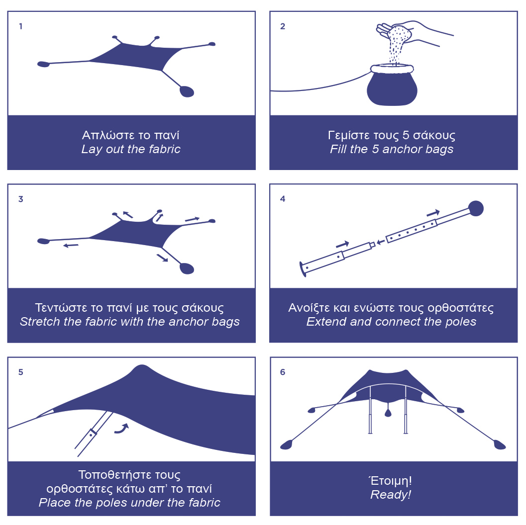 • Περιλαμβάνονται 4 σάκοι που γεμίζουν με άμμο ή βότσαλα για την σταθεροποίηση της τέντας