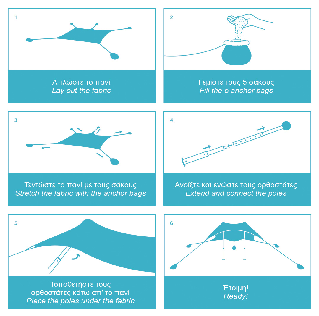• Περιλαμβάνονται 4 σάκοι που γεμίζουν με άμμο ή βότσαλα για την σταθεροποίηση της τέντας