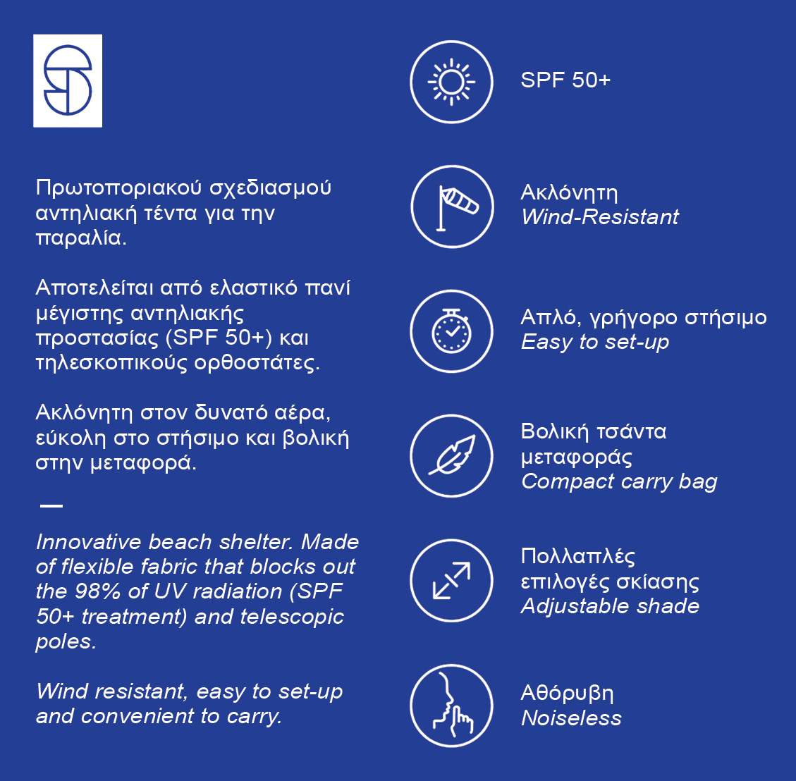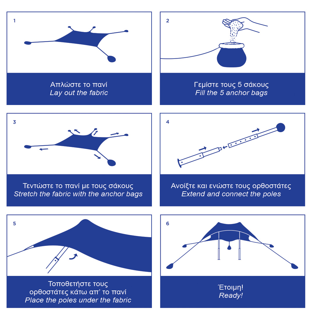 • Περιλαμβάνονται 4 σάκοι που γεμίζουν με άμμο ή βότσαλα για την σταθεροποίηση της τέντας